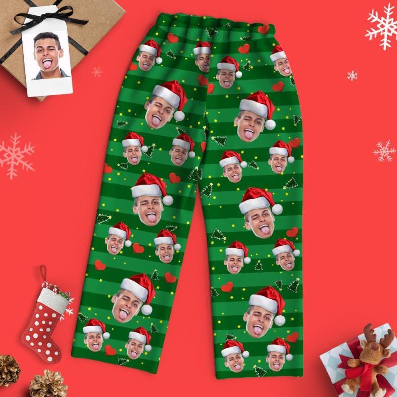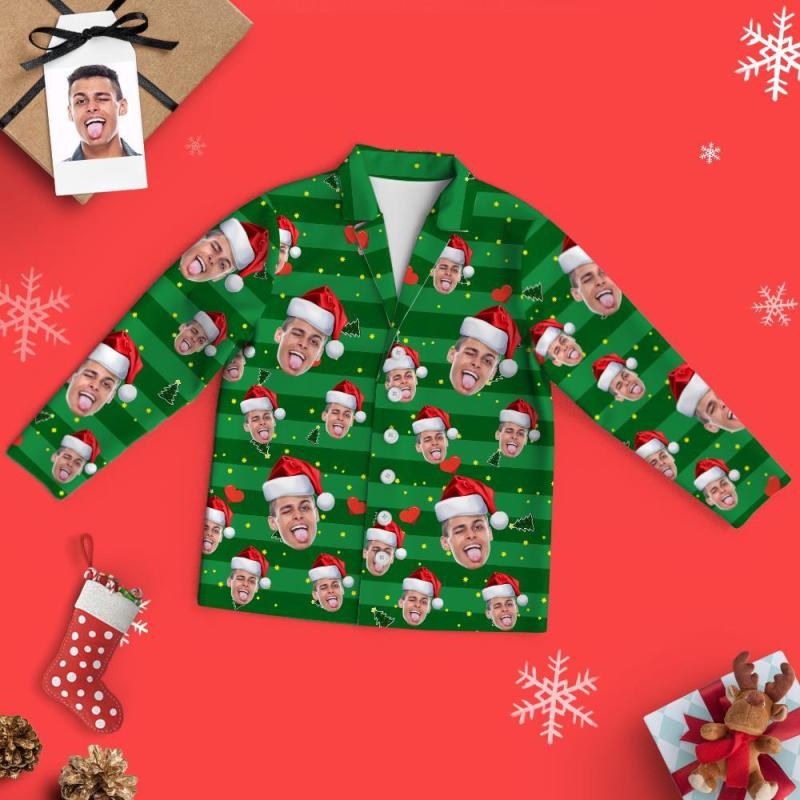 Benutzerdefinierte Weihnachten Gesicht Pyjamas Familie Set - Grüne Streifen Santa Hut