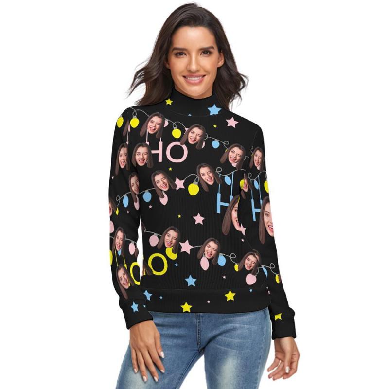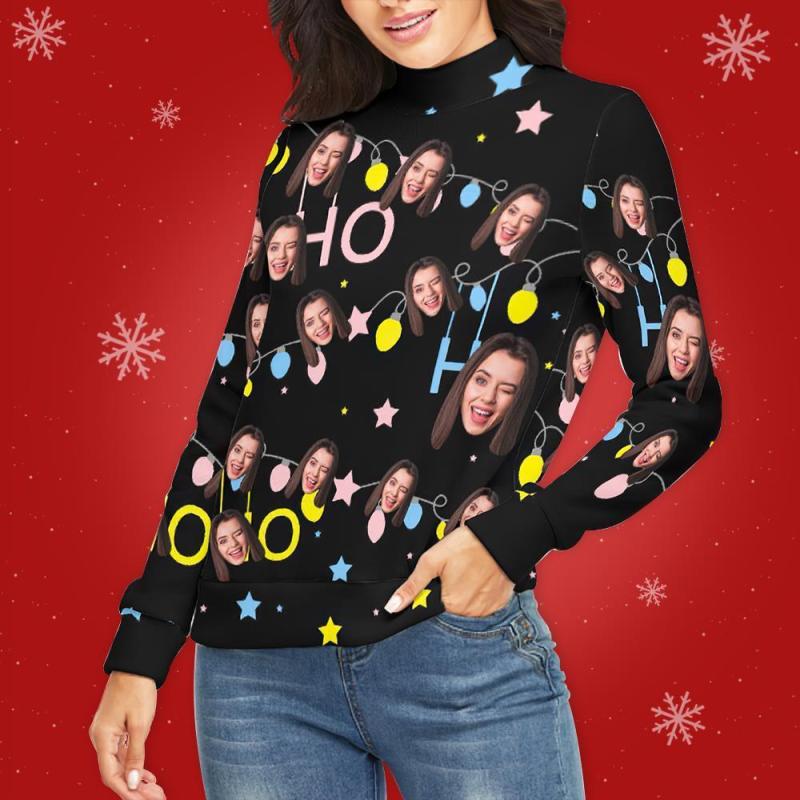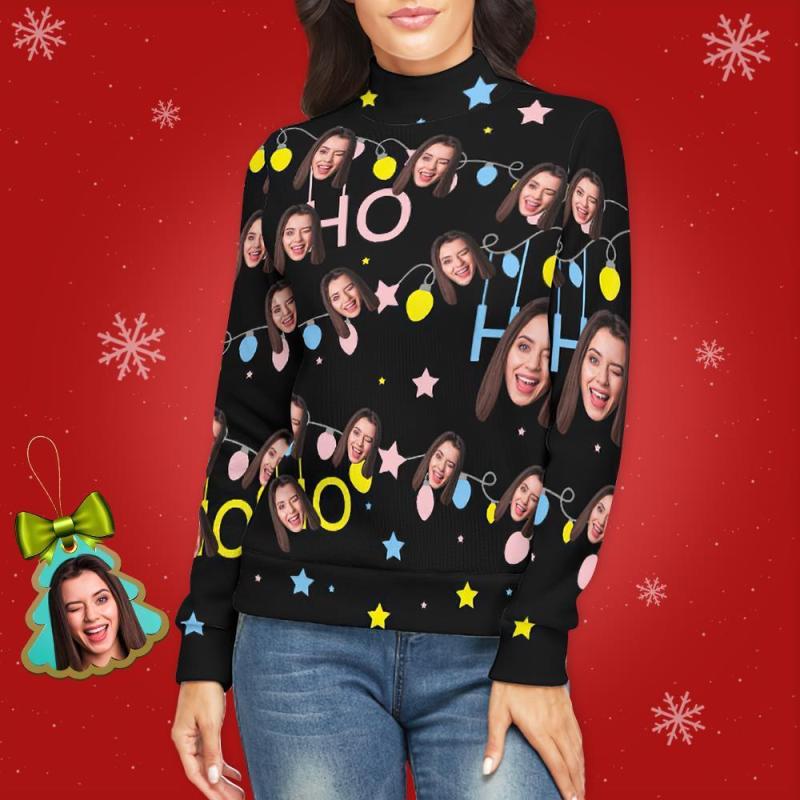 Benutzerdefiniertes Gesicht lRollkragenpullover für Damen Weihnachtspullover Gestrickte lose Pullover - Weihnachtsbeleuchtung