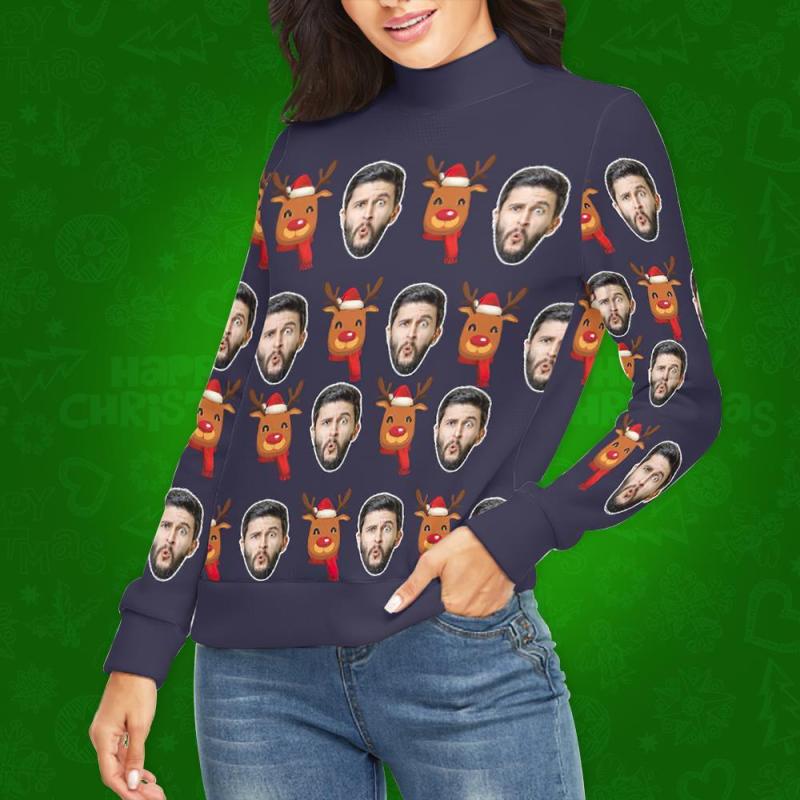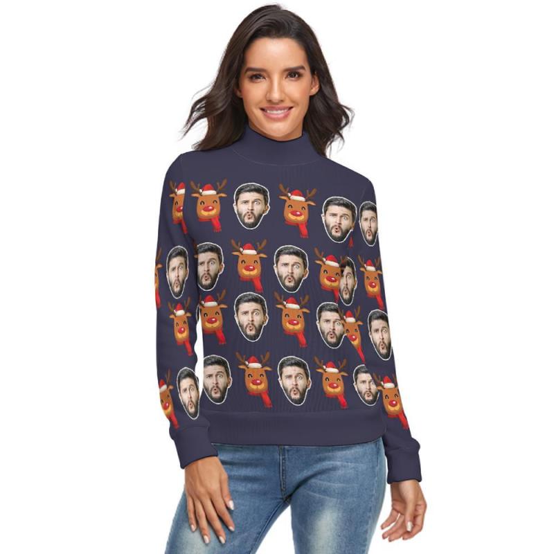 Benutzerdefiniertes Gesicht lRollkragenpullover für Damen Weihnachtspullover Gestrickte lose Pullover - Weihnachten Rudolph