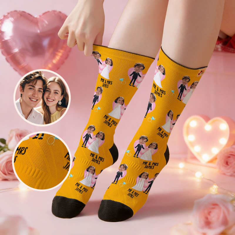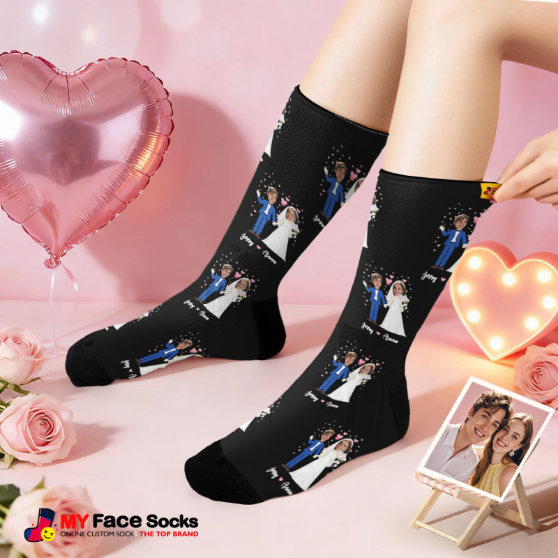 Personalisierte Socken Mit Schwarzem Gesicht Im Hochzeitsmotiv, Namenszügen Des Paares Und Foto – Ein Süßes Geschenk Für Paare Zum Valentinstag